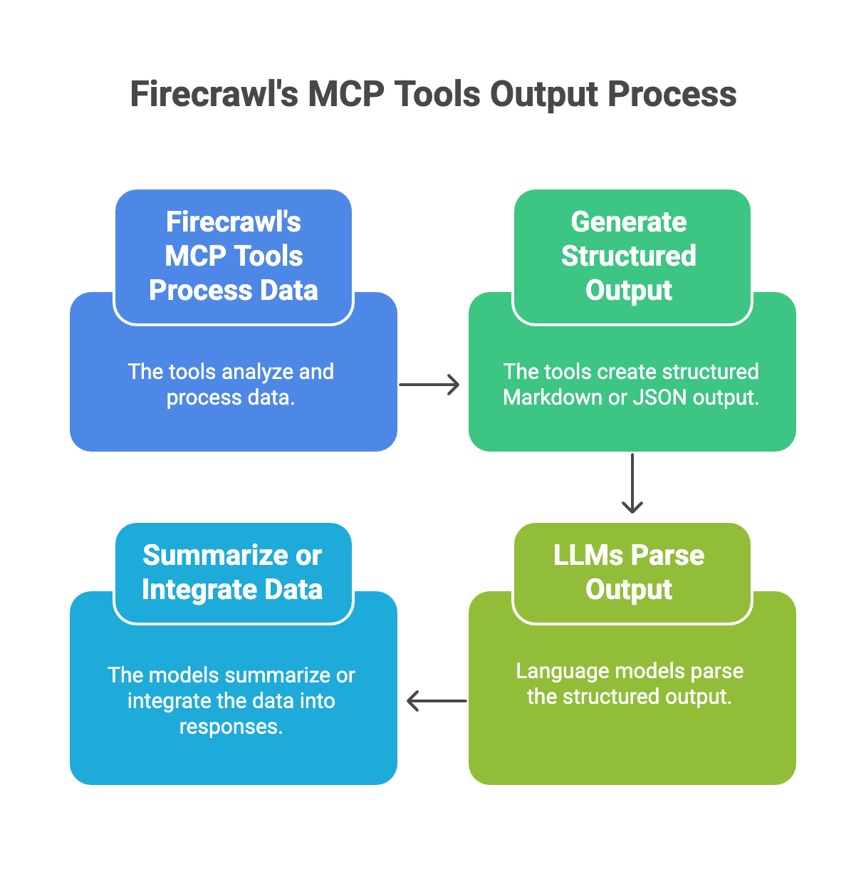 The output from Firecrawl's MCP tools is designed to be highly structured and AI-friendly, typically returning clean Markdown or JSON, which LLMs can easily parse, summarize, or integrate into their responses.