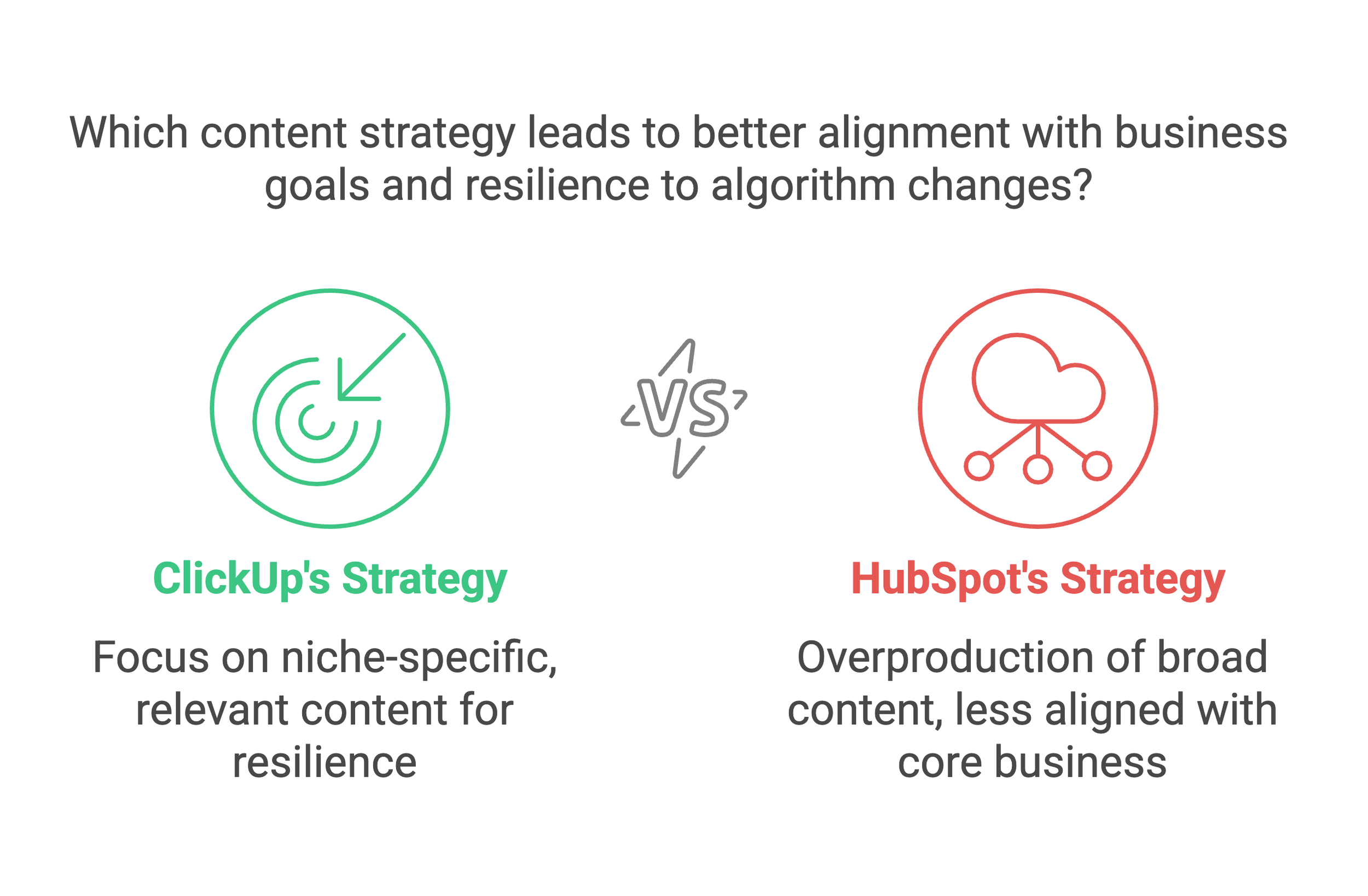 The contrasting experiences of HubSpot and ClickUp during Google’s 2024 updates highlight the risks of prioritizing broad, high-traffic keywords over business relevance. HubSpot’s decline underscores the growing importance of aligning content with topical authority, while ClickUp’s stability shows how a focused, intent-driven content strategy can withstand algorithmic changes.