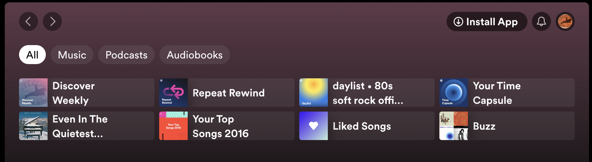 The image below is in the middle tile or section of Spotify's main screen. It shows a list of currently accessed playlists and albums or records. This is so you and get back into listening to music quickly as you can and Spotify knows you that.