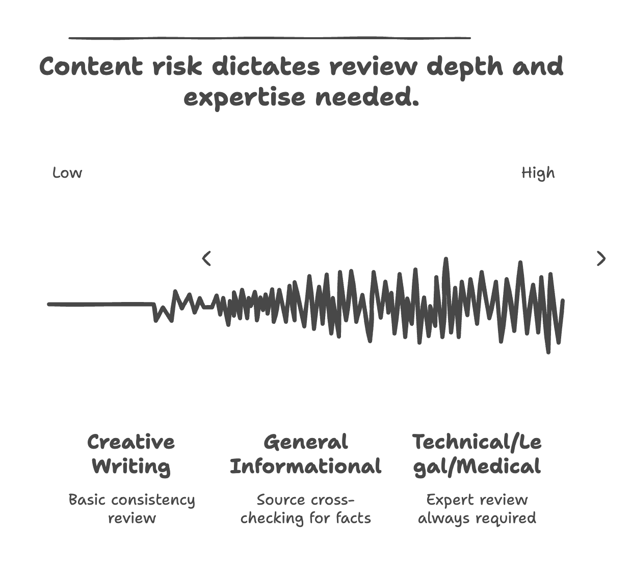 - Low-risk content (creative writing): Basic review for logical consistency.